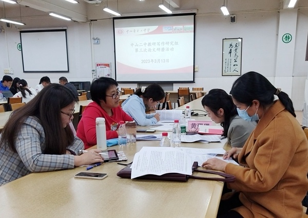 講座結(jié)束后,寫作組成員分成三個小組,來到校圖書館二樓閱覽室開展論文研磨活動,聆聽寫作專家的指導,積極與專家交流,認真記錄專家的修改意見。研磨活動持續(xù)到晚上九點半,教研的熱情點亮了整個閱覽室,相信中山市第二中學寫作組將不斷結(jié)出豐碩的教研成果。