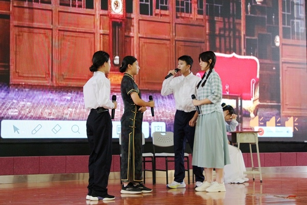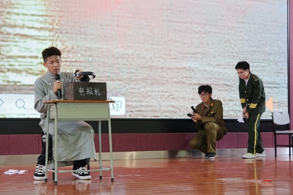 第一個(gè)出場(chǎng)的是高二4班、11班、15班聯(lián)合出品的話劇《黎明》。演員們通過表演為觀眾們講述了一位地下情報(bào)輸送者不惜冒著被敵人發(fā)現(xiàn)的風(fēng)險(xiǎn),毅然決定發(fā)送電報(bào),最終英勇赴義的故事。革命者倒在了黎明前,用肩扛起了黎明時(shí)的太陽(yáng)!
