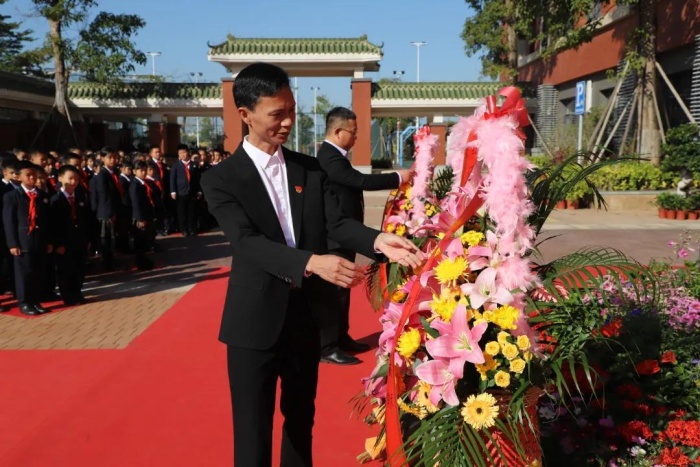 面對(duì)孫中山先生銅像,全體師生肅然而立,4名男教師抬起花籃,21名少先隊(duì)員手捧鮮花,緩步走向?qū)O中山先生銅像前,代表紀(jì)小全體師生、家長代表敬獻(xiàn)花籃、鮮花。謝志斌校長、家委會(huì)副會(huì)長席鵬先生上前整理花籃緞帶。紀(jì)小領(lǐng)導(dǎo)班子、家委會(huì)代表在孫中山先生銅像緩緩繞行一周后,全體師生、家長代表一起向?qū)O中山銅像三鞠躬,表達(dá)對(duì)孫中山先生的敬意與懷念。