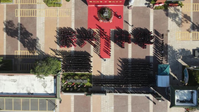 上午8時(shí)50分許,美麗的紀(jì)小校園在冬日暖陽的照耀下顯得分外莊嚴(yán)肅穆,全體師生、家長代表有序在學(xué)校廣場(chǎng)列隊(duì)肅立,三、四年級(jí)學(xué)生站立成“振興中華”四個(gè)大字。
