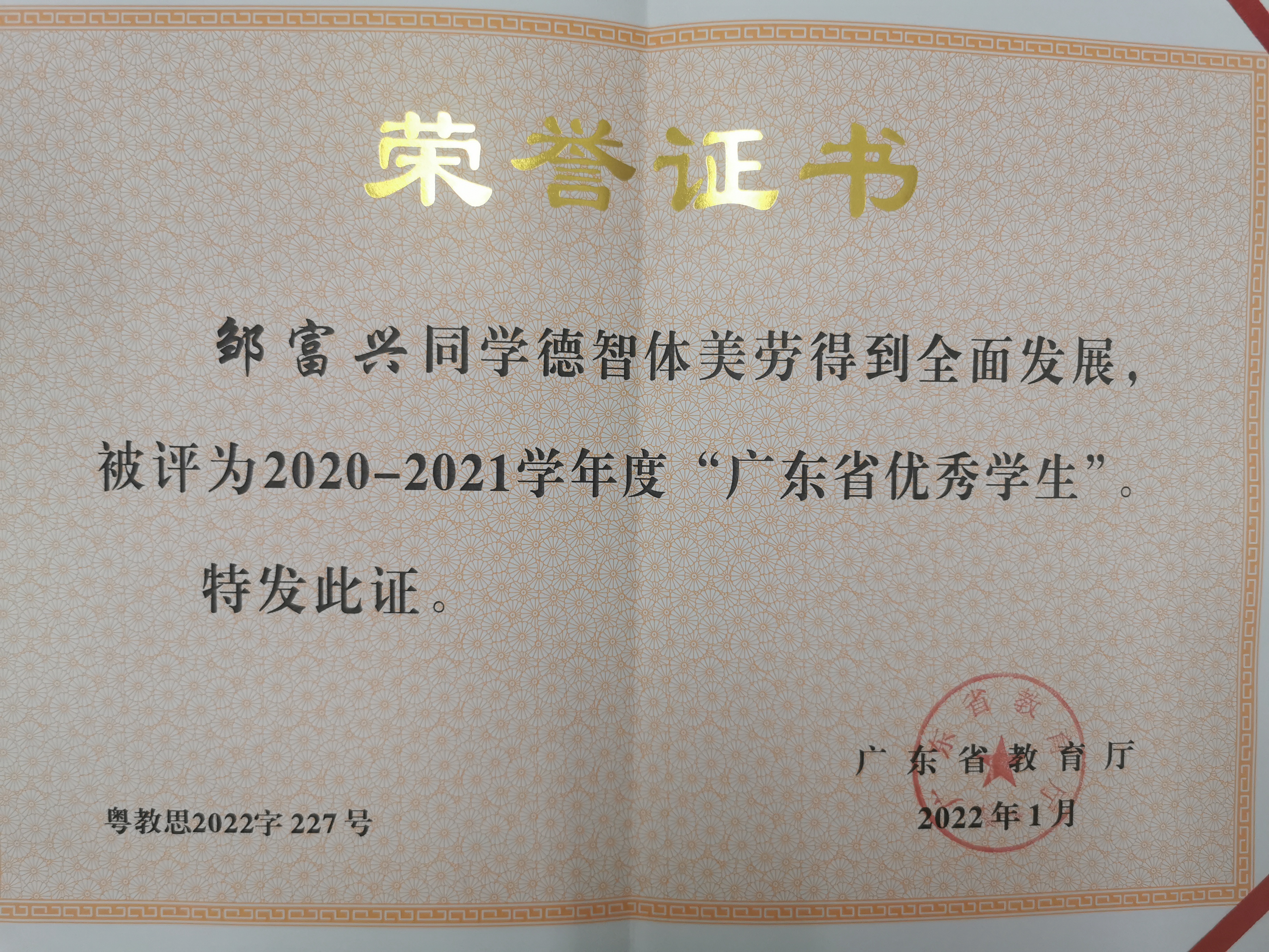 立德樹人,五育并舉,彰顯榜樣力量!日前,在廣東省教育廳組織的評選表彰中,我校高三(1)班鄒富興同學德智體美勞全面發(fā)展,榮獲2020-2021學年度“廣東省優(yōu)秀學生”稱號,全省共432名學生入選。