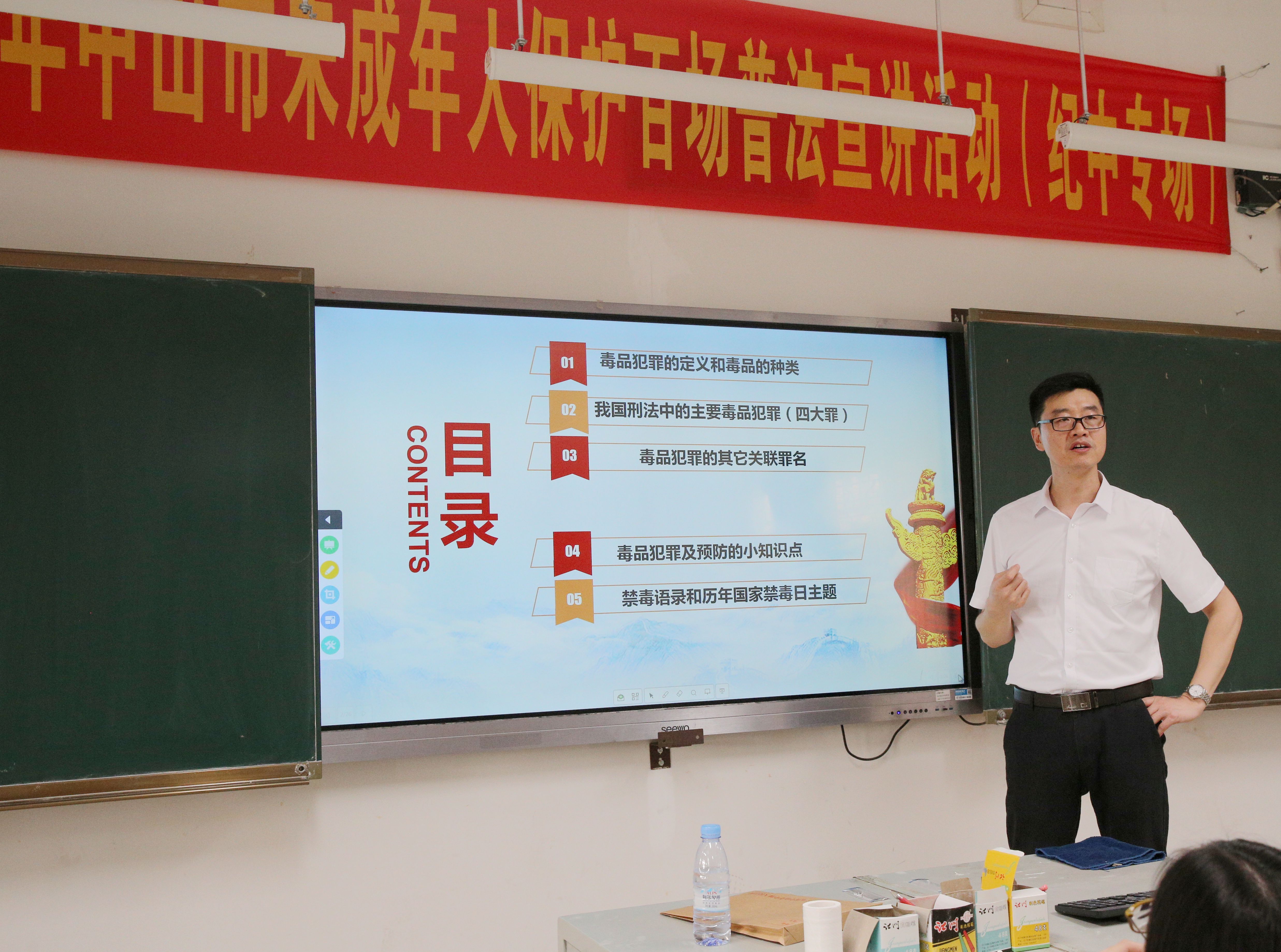 在第35個國際禁毒日來臨之際,為進(jìn)一步增強(qiáng)未成年人遠(yuǎn)離毒品的意識,提高廣大學(xué)生識毒、拒毒、防毒的能力,營造良好的校園禁毒氛圍,呵護(hù)未成年人身心健康成長,我校德育處與團(tuán)委積極開展“青春如夢,校園如家,健康人生,綠色無毒”主題教育活動。6月24日下午,受中山市未成年人保護(hù)工作領(lǐng)導(dǎo)小組委托,中山市中級人民法院審判員、市未成年人普法宣講講師團(tuán)成員史國榮法官到我校開展題為“毒品犯罪及預(yù)防”的專題講座,本次講座也標(biāo)志著與法“童”行,“未”你而來-2022年中山市未成年人保護(hù)百場普法宣講活動正式啟動。
