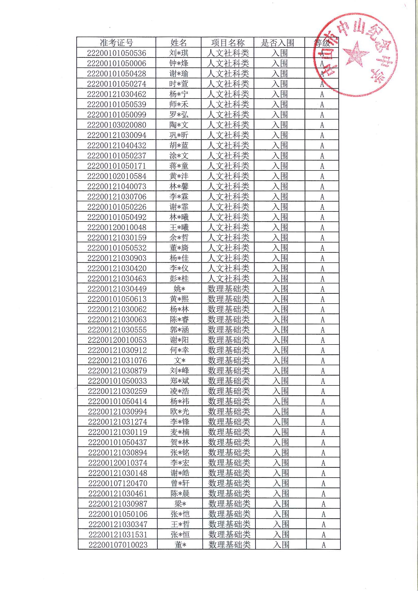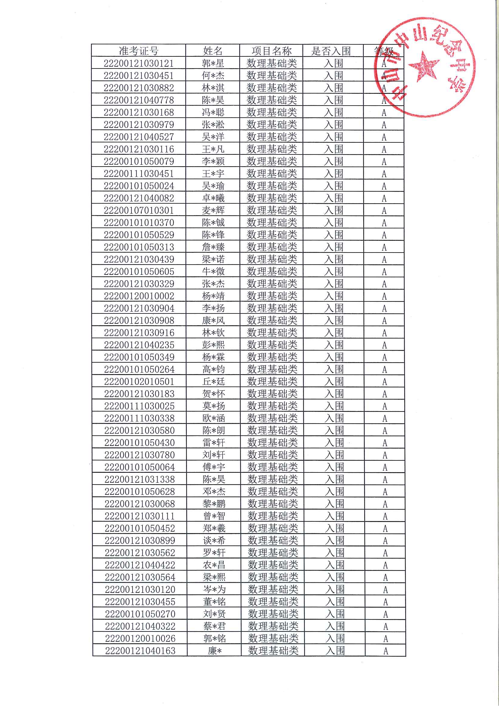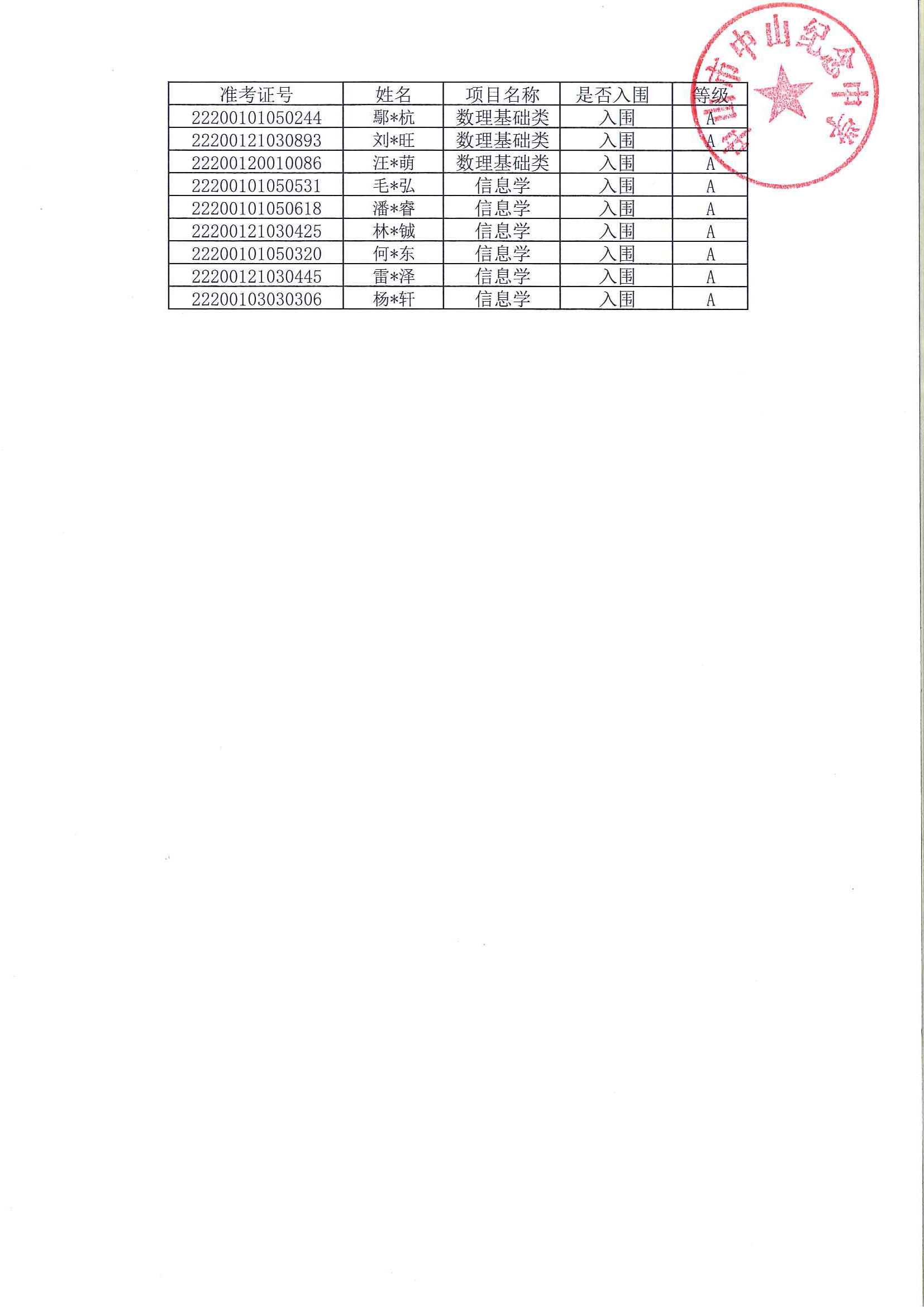 根據(jù)《中山市教育和體育局關(guān)于做好中山市普通高中學(xué)科類自主招生工作的通知》(中教體通〔2022〕88 號(hào))和《中山紀(jì)念中學(xué) 2022 年“強(qiáng)基班”自主招生簡(jiǎn)章》文件精神,我校7月7日對(duì)獲得自主招生考核資格的學(xué)生進(jìn)行了考核。經(jīng)考核小組認(rèn)真、規(guī)范、公平、公正考核和評(píng)分,現(xiàn)將入圍我?!皬?qiáng)基班”自主招生資格名單予以公示,接受社會(huì)監(jiān)督。