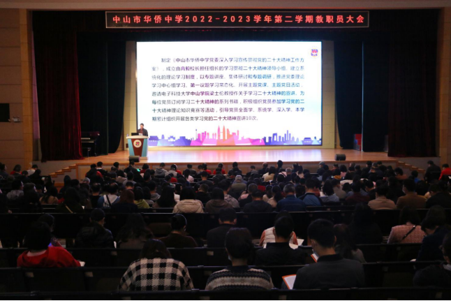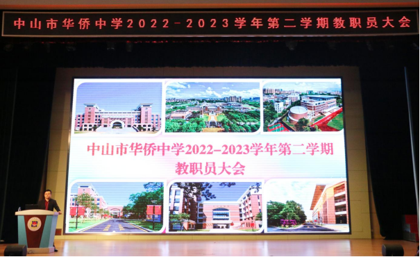 大會首先由李勇主任介紹新學(xué)期人事變動。隨后,高毅校長以“凝心聚力擔(dān)使命 踔厲奮發(fā)育新人”為題,從黨建、紀(jì)檢、德育、教學(xué)、科研、體藝、師德建設(shè)、后勤服務(wù)、集團(tuán)化辦學(xué)等方面對學(xué)校上學(xué)期工作進(jìn)行了總結(jié)。在過去的一學(xué)期,學(xué)校團(tuán)結(jié)帶領(lǐng)全體教職員工深入學(xué)習(xí)貫徹黨的二十大精神,落實(shí)立德樹人根本任務(wù),堅持“名校+僑校”發(fā)展戰(zhàn)略,凝心聚力,真抓實(shí)干,再創(chuàng)僑中新輝煌:學(xué)校成功承辦2022粵港澳大灣區(qū)中小學(xué)校長論壇;獲評“廣東省第二批普通高中新課程新教材實(shí)施省級示范?!保ㄖ猩轿ㄒ唬恢猩绞腥A僑中學(xué)教育集團(tuán)被評為第二批省級優(yōu)質(zhì)基礎(chǔ)教育集團(tuán)培育對象;我校被評為“廣東省紅十字標(biāo)準(zhǔn)?!?;初中部獲市教育質(zhì)量評價一等獎;我校青年志愿者協(xié)會榮獲“中山市優(yōu)秀青年志愿者服務(wù)團(tuán)隊”稱號;我校衛(wèi)生保健中心榮獲第22屆中山市“青年文明號”。