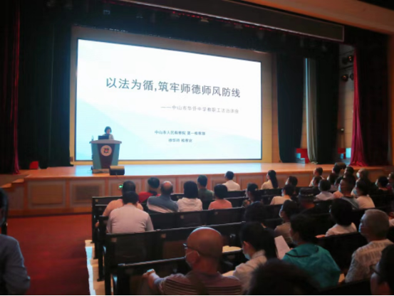 接著,我校邀請(qǐng)了中山市人民檢察院第一檢察部、未成年人檢察辦公室四級(jí)高級(jí)檢察官、中學(xué)法治副校長及法治輔導(dǎo)員徐華玲檢察官為我校全體教職員作《以法為循,筑牢師德師風(fēng)防線》的主題講座。在講座上,徐檢察官從教師職業(yè)規(guī)范、師風(fēng)師德建設(shè)、依法執(zhí)教指引三方面對(duì)老師們進(jìn)行了普法教育。以案說法,用現(xiàn)實(shí)而具體的案例告誡老師們務(wù)必堅(jiān)守師德底線,以身作則,并且給老師們介紹了教師在教育教學(xué)過程中常見的法律風(fēng)險(xiǎn)及其如何應(yīng)對(duì)的指引。