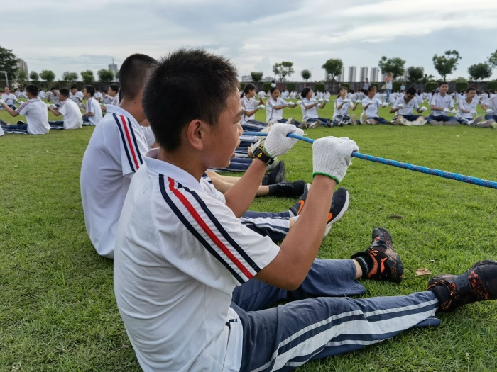 接下來(lái)進(jìn)行的是信任動(dòng)力繩。這個(gè)游戲要求所有人手握繩圍成圈,雙腳合并,用腳后跟著地,同時(shí)向后倒。一個(gè)同學(xué)在繩子上走,另外兩個(gè)同學(xué)分別在內(nèi)圈和外圈保護(hù)走繩子的同學(xué),走的過(guò)程中不能掉下來(lái),否則要重新開(kāi)始,十分鐘內(nèi)走完繩子人數(shù)最多的班級(jí)勝出。比賽伊始,同學(xué)們互相嬉鬧,但很快就有同學(xué)提出要相互團(tuán)結(jié),相互協(xié)助方能成功。在大家的齊心協(xié)力下,同學(xué)們都能順利地繞繩子走完一圈。整個(gè)過(guò)程中,同學(xué)們的笑聲和鼓勵(lì)聲回蕩在足球場(chǎng)上,每個(gè)人都在充分享受比賽帶來(lái)的興奮和快樂(lè),把平時(shí)學(xué)習(xí)生活中的煩惱和壓力都徹底釋放了出來(lái)。