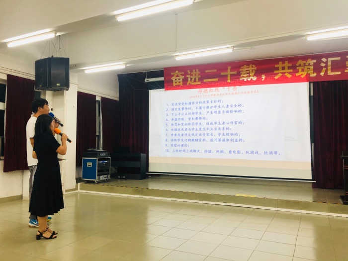 大會最后,全體教師起立,舉起右手,莊嚴的宣誓:我志愿成為一名光榮的人民教師,忠誠黨的教育事業(yè),貫徹黨的教育方針。愛國守法、愛崗敬業(yè);教書育人、關愛學生;傳承文明、勇于創(chuàng)新;嚴謹治學、啟智求真;為人師表、樂于奉獻。為實現(xiàn)中華民族的偉大復興而努力奮斗!鏗鏘有力的誓言,響徹整個報告廳,匯翠學校全體教師將時刻牢記師德準繩,自覺樹立為人師表、育人為本、勇于創(chuàng)新的師德風范。