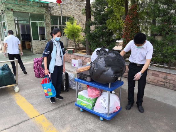 13時(shí)整,初三學(xué)生正式開始報(bào)到。出于安全考慮,在寫著“德恒學(xué)校歡迎高三、初三孩子回家”的紅色帳篷里,返校學(xué)生需要“過五關(guān)斬六將”,比如,站在一米以外向班主任遞交開學(xué)所需資料,由校醫(yī)監(jiān)測體溫,行李消毒等等,經(jīng)過層層的驗(yàn)核,方能進(jìn)入他們闊別已久的校園,充滿儀式感的返校流程讓疫情之后的復(fù)學(xué)變得更富有意義。除此之外,學(xué)生本次返校和以往最大的不同在于,由于疫情,家長們只能站在緩沖區(qū)外,目送孩子進(jìn)入校園,所以繁重的行李成了他們最頭痛的事情。事實(shí)證明,家長和孩子們的擔(dān)憂完全是多余的,由九年級(jí)的科任老師和學(xué)校行政臨時(shí)組成的“德恒搬運(yùn)隊(duì)”,“文能教書育人,武能負(fù)重前行”,整個(gè)過程不遺余力地幫助孩子們運(yùn)送行李,成為當(dāng)日復(fù)學(xué)路上一道亮麗的風(fēng)景線,這樣的暖心之舉得到了在場家長和學(xué)子們的一致稱贊。