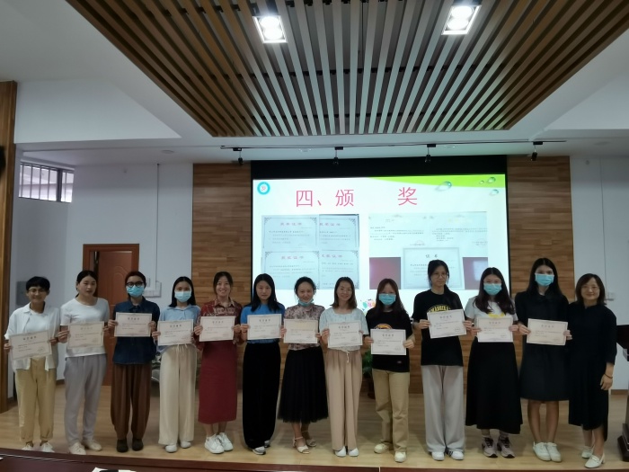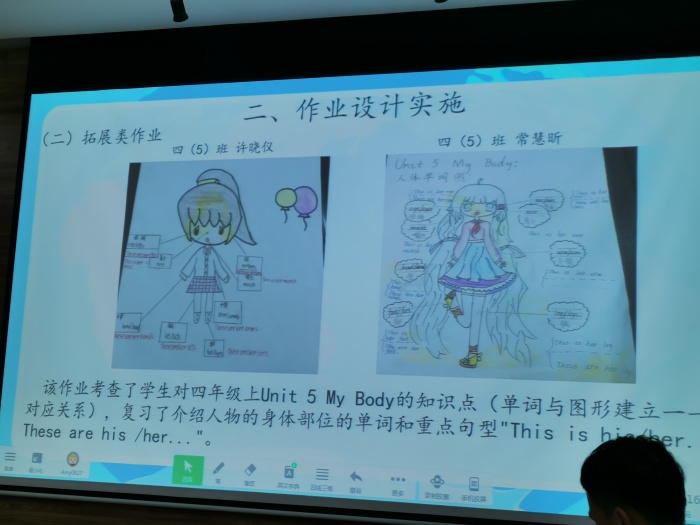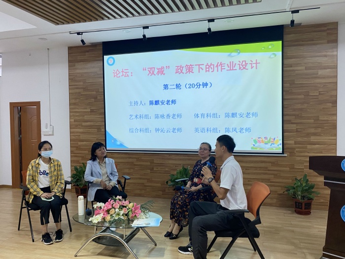 第二組上場的是由任教英語的陳鳳老師和任教術科的陳麒安、陳泳香和鐘沁云等3位老師。陳鳳老師圍繞“減量不減質”的旨意,從基礎類、拓展類和探究類等方面來分享個人和科組老師的做法,如:看圖選序號,改變以往沉悶的抄寫單詞的方式,讓學生在積極動腦中把單詞歸類書寫。又如:學生制做水果拼盤后說水果或動物單詞,學完身體部位單詞后讓學生畫圖寫句子或錄制聽說視頻,用所學的單詞、句子口頭描述自己的身體部位,或描述房子平面圖或進行繪本閱讀。她還談到寫句配圖、制作手抄小報、自制繪本等作業(yè)能發(fā)揮學生所長,讓學科間深度融合,促進學生多智能的發(fā)展。其它三位老師雖教術科,但根據(jù)學科特點,布置有針對性的作業(yè),如網(wǎng)上測評、跳繩打卡,或緊扣教材設計多樣的作業(yè),如:道德與法治課里的表格、視頻、愛心樹等等。代表發(fā)言的老師圖文并茂、準備充分、理論聯(lián)系實際,生動地為在場的老師展示作業(yè)設計方面的成果,讓每位老師學有所獲。