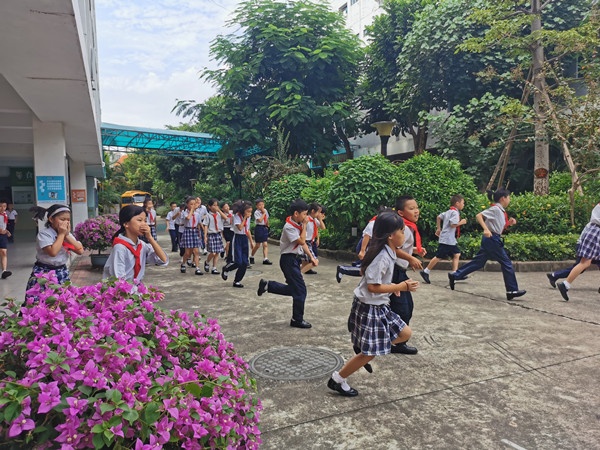 當(dāng)天下午1:40教學(xué)區(qū)、宿舍區(qū)各樓層鳴響警報(bào),全體進(jìn)入應(yīng)急狀態(tài)。同學(xué)們?cè)诶蠋煹闹敢拢⒓磸澭?、用手捂住口鼻,緊張有序地沿著逃生路線,迅速地向操場(chǎng)疏散撤離。從警報(bào)聲響起到最后一個(gè)同學(xué)來(lái)到球場(chǎng),共用時(shí)2分50秒,全體師生認(rèn)真參與。