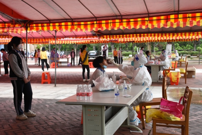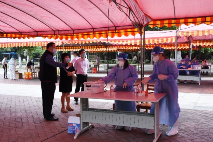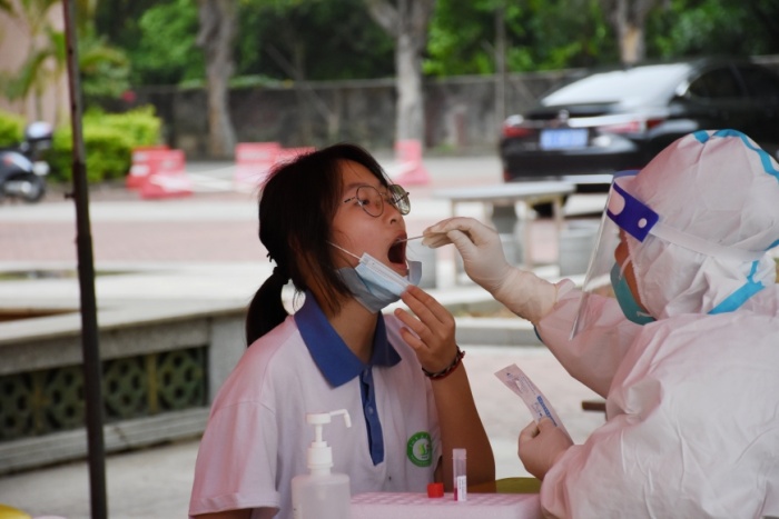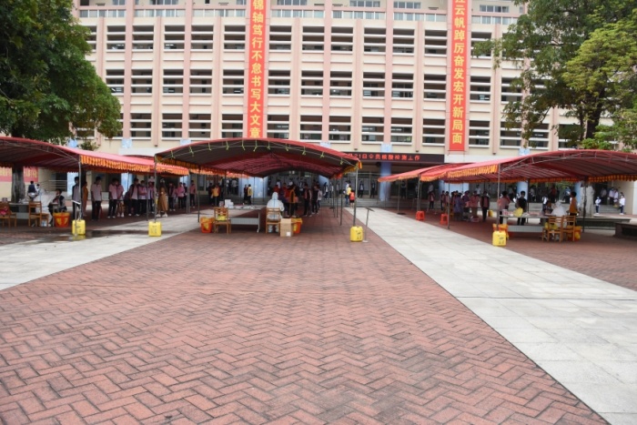 檢測現(xiàn)場,學(xué)校行政和教師按分工安排各就各位,維持現(xiàn)場秩序及進(jìn)行“葵花碼”信息采錄。學(xué)生們也在班主任和科任教師的引導(dǎo)下,自覺規(guī)范佩戴口罩,10人一組,前后一米線間隔,分批進(jìn)場接受咽拭子采集。整個檢測現(xiàn)場高效有序,僅用三個小時就完成了全校師生員工的核酸檢測采樣工作。