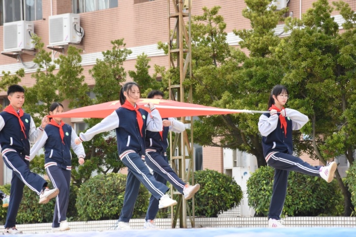 隨著“出旗”一聲令下,國旗隊的同學邁著矯健的步伐向國旗臺走來。在激昂的國歌聲中,升旗手振臂一揮,鮮艷的五星紅旗徐徐展開,在陽光的映照下冉冉升起。三角中學全校師生肅立,注目著五星紅旗齊唱國歌,歌聲嘹亮,熱血澎湃。