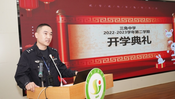 典禮的第三項流程是三角中學法制副校長梁吉慶警官為師生們做了一堂法制教育專題講座。梁警官對學生法紀觀念、交通安全、品德養(yǎng)成、安全防范等方面進行了有針對性的講解,讓在校師生更加直觀地了解到提高法制意識和安全防范意識的重要性,鼓勵學生們好好學習、明辨是非,遵守法律法規(guī)。