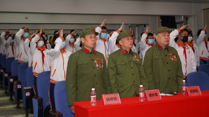 典禮的第二項流程為鎮(zhèn)退伍老兵獻上鮮花,并由鎮(zhèn)退伍老兵翁錦泉發(fā)言。講座現(xiàn)場,翁錦泉老先生用生命的故事,向同學們講述了戰(zhàn)火紛飛年代那一段刻骨銘心回憶。翁錦泉老先生用奉獻無言,續(xù)寫一名老兵的忠誠與擔當!我們?nèi)w師生要向英雄致敬,為祖國奮斗!