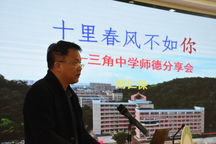 三角中學(xué)第一期師德講座由劉仁保老師以題為《十里春風(fēng)不如你》進(jìn)行分享。他那感人肺腑的故事,聲情并茂的講述,充分展示了劉老師高度的責(zé)任心和高尚的職業(yè)操守。他用一生踐行自己的諾言——用愛和責(zé)任守住學(xué)生眼中的光——讓探索與行動(dòng)陪伴生命,用生命影響生命、陪伴生命,讓生命慢慢成長(zhǎng)。同時(shí),劉老師從守著“你”,潛心向?qū)W、愛著“你”,揚(yáng)帆啟航、伴著“你”,奮楫篤行三個(gè)方面分享他工作以來的心路歷程,分享了他在教學(xué)工作中如何享受幸福、實(shí)現(xiàn)自己的人生價(jià)值的方法,他用發(fā)人深省的故事、鮮活生動(dòng)的案例,深入淺出地詮釋了做人做事做學(xué)問的真諦,他那無私奉獻(xiàn)的精神、澎湃的激情感染了在座的所有教師。