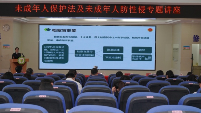 會(huì)議的第一項(xiàng)議程,由中山市第二市區(qū)人民檢察院鄧艷檢察官以“檢校共建防護(hù)網(wǎng),護(hù)航青春不停步”為題進(jìn)行未成年人保護(hù)法及未成年人防性侵專(zhuān)題講座。講座上,鄧檢察官?gòu)男郧趾﹄x我們的校園遠(yuǎn)嗎?性侵害的法律適用、性侵害的預(yù)防和應(yīng)對(duì)三個(gè)方面引入,并通過(guò)明確的數(shù)據(jù),清晰的圖表和具體的案例重點(diǎn)講解了校園安全隱患、強(qiáng)奸罪、強(qiáng)制猥褻、侮辱罪、猥褻兒童罪和表現(xiàn)形式、如何預(yù)防、發(fā)現(xiàn)、應(yīng)對(duì)未成年人性侵害案件等方面,她指出從預(yù)防的角度看,主要有兩個(gè)方面,加強(qiáng)校園安全管理和落實(shí)防性侵法治教育。在應(yīng)對(duì)措施方面,鄧檢察官以“一號(hào)檢察建議”為切入點(diǎn),圍繞2020年5月7日最高檢等九部門(mén)聯(lián)合印發(fā)的《關(guān)于建立侵害未成年人案件強(qiáng)制報(bào)告制度的意見(jiàn)(試行)》,結(jié)合《中華人民共和國(guó)刑法》等法律,通過(guò)觀看視頻、學(xué)習(xí)典型案例等方式,生動(dòng)形象地宣講了強(qiáng)制報(bào)告制度的出臺(tái)背景、報(bào)告主體、應(yīng)報(bào)情形、如何報(bào)告及追責(zé)機(jī)制等內(nèi)容,并對(duì)教育工作中如何貫徹落實(shí)強(qiáng)制報(bào)告制度進(jìn)行重點(diǎn)解讀,幫助教職工更好的理解強(qiáng)制報(bào)告制度的重要意義和執(zhí)行必要,讓學(xué)校教師明確自身職責(zé),明確新時(shí)代教師職業(yè)規(guī)范和師德底線。鄧檢察官細(xì)致的講解讓在場(chǎng)的老師們對(duì)《未成年人保護(hù)法》和預(yù)防未成年人性侵有了更加深入的了解。