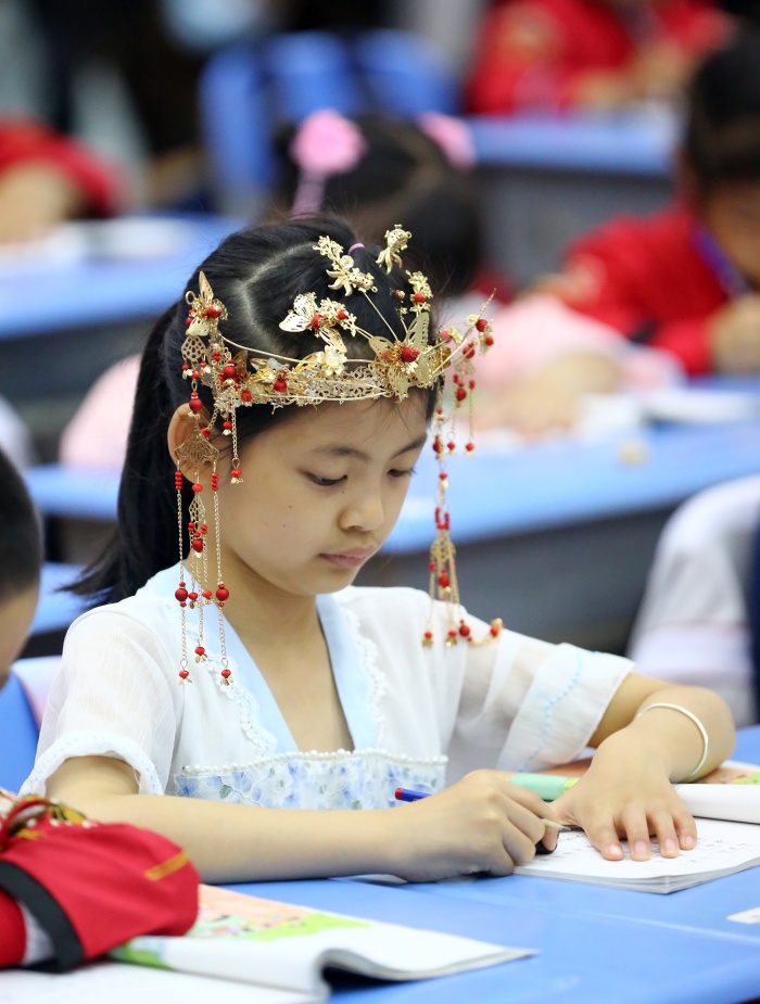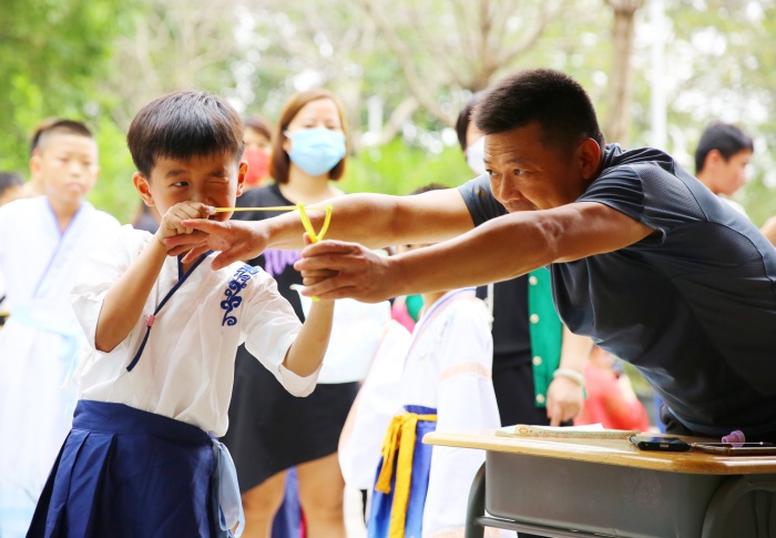 在第二屆傳統(tǒng)文化暨讀書(shū)節(jié)展示活動(dòng)中,一二三年級(jí)的同學(xué)們表演了課本劇《荷葉圓圓》,一同齊誦《弟子規(guī)》、漢樂(lè)府詩(shī)歌《江南》,在優(yōu)美的古詩(shī)詞中感受閱讀的樂(lè)趣。展示活動(dòng)后,同學(xué)們與爸爸媽媽一起參與到游園活動(dòng)中,“甲骨文里尋始祖”“腦筋運(yùn)轉(zhuǎn)謎底見(jiàn)”“你演我猜合作樂(lè)”“漢字啄木鳥(niǎo)”“正中靶心”等游戲攤位前排滿(mǎn)了摩拳擦掌的小朋友。“各類(lèi)小游戲基本上都和傳統(tǒng)文化有關(guān)聯(lián),踢毽子、射箭、打陀螺、踩高蹺等等,孩子們穿著漂亮的傳統(tǒng)服飾跑來(lái)跑去熱情參與,我感受到了他們的快樂(lè)?!币荒昙?jí)林子陽(yáng)的爸爸說(shuō),卓雅“活動(dòng)育人”的理念在開(kāi)放日活動(dòng)中有了很好的體現(xiàn),同學(xué)們?cè)谑斋@快樂(lè)的同時(shí)也學(xué)到了知識(shí)。