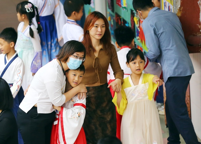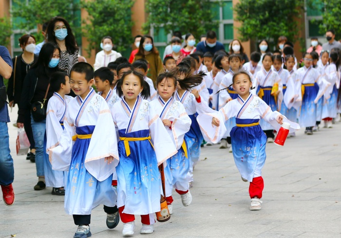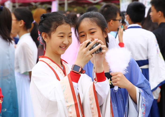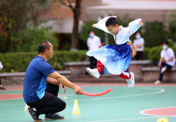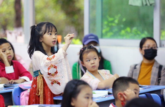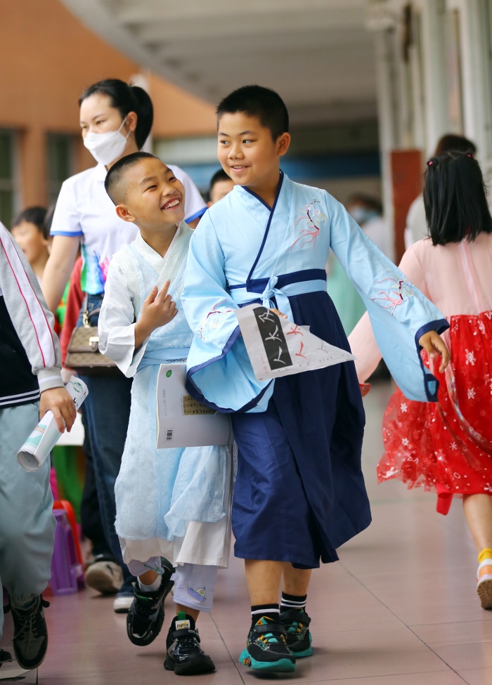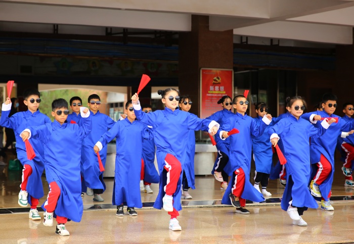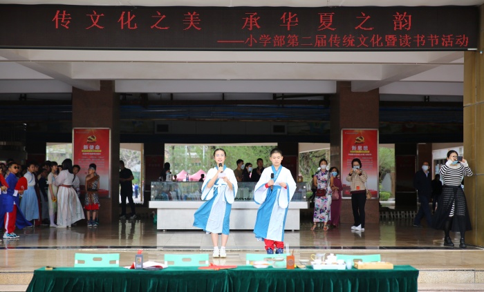 大課間,家長(zhǎng)們來(lái)到操場(chǎng),觀看“課外閱讀校本課程成果展示”,同學(xué)們身著漢服盛裝出席,手持折扇風(fēng)度翩翩,以情景劇、歌舞表演、手語(yǔ)操、詩(shī)歌朗誦等形式,再現(xiàn)西游記、千字文、魯濱遜漂流記等中外名著名篇的精彩內(nèi)容,小學(xué)部還邀請(qǐng)家長(zhǎng)身著傳統(tǒng)服飾參與到茶藝表演中,與同學(xué)們一起感受優(yōu)秀的中國(guó)傳統(tǒng)文化。