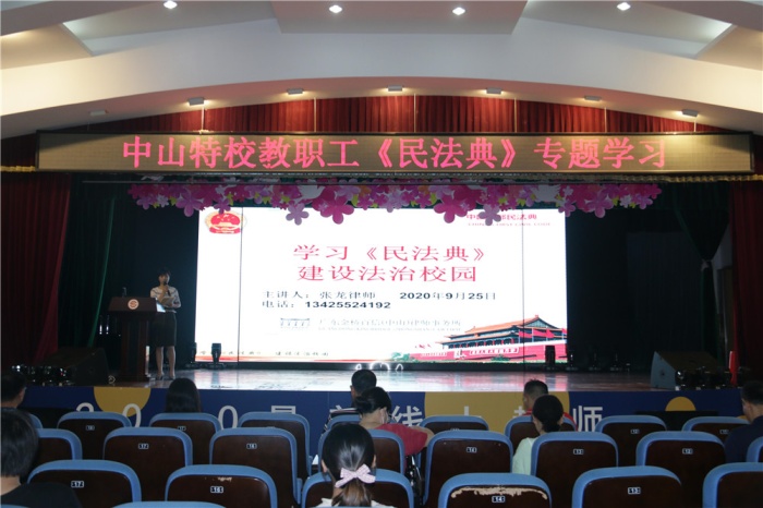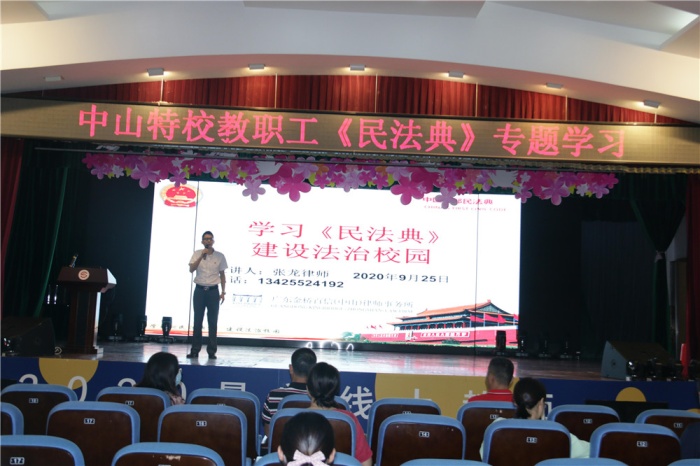 為深入宣傳和學(xué)習(xí)《中華人民共和國民法典》,營造普法、知法、學(xué)法、守法、用法的濃厚氛圍,進(jìn)一步提高教師學(xué)法、懂法、用法的法治意識,9月25日下午,中山特校邀請廣東金橋百信(中山)律師事務(wù)所張龍律師來校,面向全體教師開展《民法典》專題解讀普法講座。