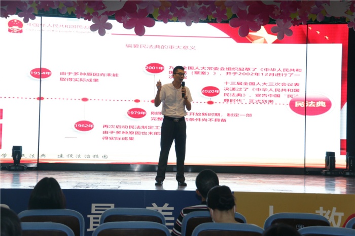 《民法典》是新中國成立以來第一部以“法典”命名的法律,共7編、1260條,各編依次為總則、物權(quán)、合同、人格權(quán)、婚姻家庭、繼承、侵權(quán)責(zé)任以及附則,被譽為社會生活的百科全書,覆蓋每一個公民生活、工作的方方面面。它關(guān)系到每個人的切身利益,了解學(xué)習(xí)《民法典》的相關(guān)規(guī)定,更新法律知識,知法學(xué)法、依法執(zhí)教,是每位教師的責(zé)任,將為全體教師更好地履職盡責(zé)打下堅實基礎(chǔ)。張律師通過一系列法律問題及解答,從日常生活中的法律案例談開去,明確了相關(guān)情況的法律定性與處理方式,強化了老師們的法治思維,提高了老師們運用法治方式開展工作的能力。