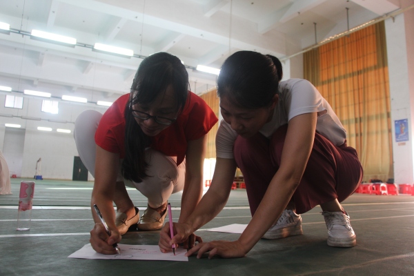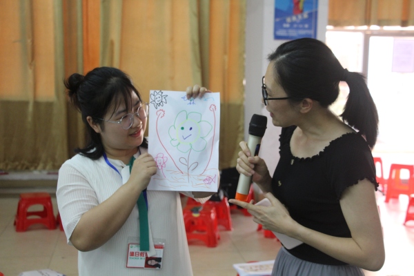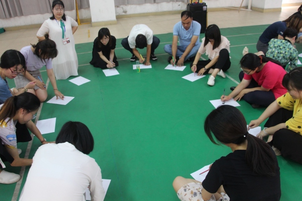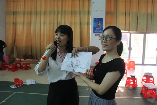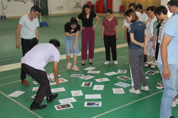活動特聘請了中山市中小學(xué)心理健康教育講師團(tuán)講師、沙欄中學(xué)心理健康專職教師溫倩藝為學(xué)校全體教師進(jìn)行“教師壓力與情緒管理”的團(tuán)康活動。首先溫老師將老師們分為5個組,每一組選出兩個隊長,由隊長帶領(lǐng)大家完成接下來的活動?;顒臃譃槿齻€部分,第一個活動叫‘看圖猜數(shù)字’。每一隊成員需要團(tuán)結(jié)合作,快速的猜出每一幅圖片所代表的數(shù)字,之后由隊長快速的送達(dá)到老師手中,又快又準(zhǔn)的組獲勝。第二個活動是‘用畫減壓’,每一位隊員首先畫出一個點(diǎn),用點(diǎn)的大小來表示自己的壓力,接下來互相傳給下一位隊員,用畫來畫出正能量,將壓力消除。大家有說有笑的畫著,無形中減輕了大家的心理壓力。最后,老師進(jìn)行了總結(jié),對大家的積極參與表示了肯定,也希望大家能夠多愛自己,鼓勵教師自主調(diào)節(jié)自己的情緒建立積極的生活觀和工作觀。