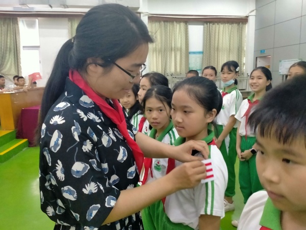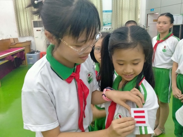 最后,少先隊(duì)大隊(duì)輔導(dǎo)員林老師和現(xiàn)任大隊(duì)長(zhǎng)梁碧盈隊(duì)員為新一屆大隊(duì)委成員授標(biāo),一枚枚小小的隊(duì)標(biāo)象征著一份大大的責(zé)任,大隊(duì)委員一定會(huì)認(rèn)真履行少先隊(duì)干部職責(zé),擔(dān)負(fù)起帶頭人的重任,為中隊(duì)、為少先隊(duì)、為學(xué)校貢獻(xiàn)力量。