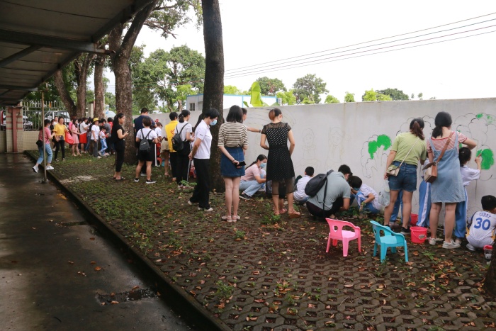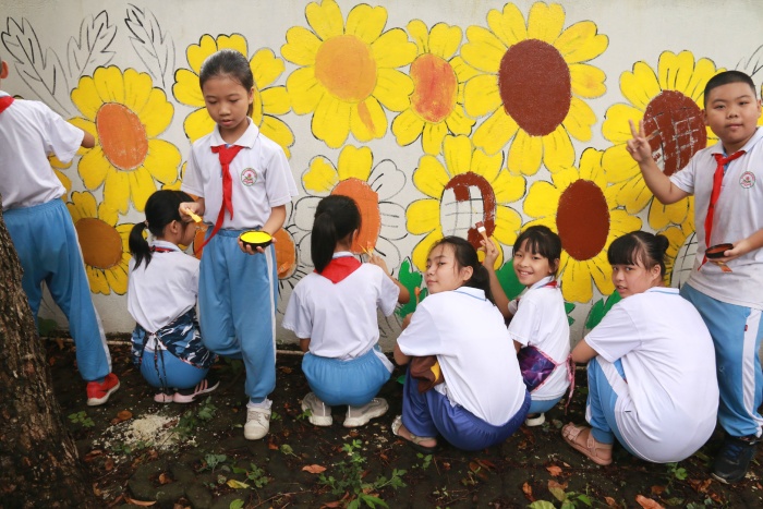 八月第一天雖然陰雨綿綿,但絲毫不影響志愿者們齊動手、共參與的熱情,所有參與本次活動的志愿者都早早地到達(dá)了活動地點(diǎn)——光明小學(xué)停車場旁的墻壁,大家都迫不及待地想要拿起自己的畫筆進(jìn)行創(chuàng)作啦!活動開始前,由美術(shù)老師鄧碧興和丁常臻老師在墻壁上勾勒出大概的繪畫輪廓;緊接著就由各個班的班主任分發(fā)繪畫工具,告知本班負(fù)責(zé)的繪畫區(qū)域以及注意事項(xiàng),只見孩子們個個都拿起畫筆,一會兒若有所思,一會兒靈機(jī)一動,家長們也不甘示弱,也使出渾身解數(shù),一會幫忙遞繪畫工具,一會兒洗畫筆,在大家的合理分工,共同努力之下,原本單調(diào)的墻壁愈發(fā)變得燦爛有趣,你看!一朵朵向日葵正在和大家打招呼呢!一棵棵大樹正努力向陽生長呢!時間過得很快,活動快要接近尾聲,但是大家卻意猶未盡,所有的志愿者努力把自己對文明城市的美好期待通過手中的畫筆呈現(xiàn)出來。