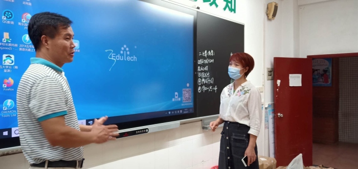 李委員一行人經(jīng)過測溫區(qū),來到課室,查看醫(yī)療應急箱應急物資配置情況,了解學校應急處理流程,認真查看環(huán)境布置、消毒防控、應急處置等是否落實到位。接著,李委員一行還專程來到學校智慧課堂示范課室,了解設(shè)備的配置情況及項目開展的進度。最后,吳博事校長向領(lǐng)導們匯報了中心小學開學的基本情況。