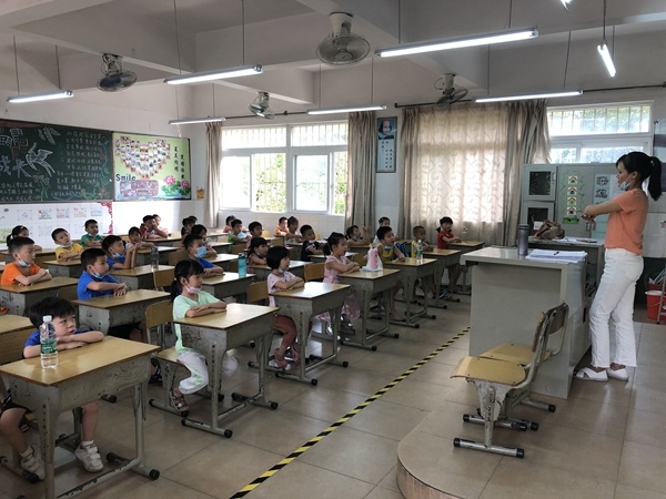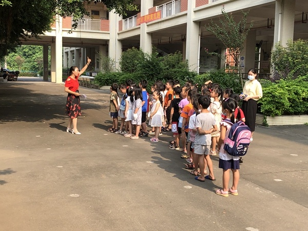 7點(diǎn)30分,高平小學(xué)東門(mén)迎來(lái)了首批“幼苗”,五個(gè)班級(jí)區(qū)域的老師也做好了充分的準(zhǔn)備。簽到、測(cè)量體溫、遞交承諾書(shū)、掃碼進(jìn)入班級(jí)群,各項(xiàng)步驟都井然有序地進(jìn)行著,孩子們?cè)诶蠋熒砗笈抨?duì),等待進(jìn)入課室。
