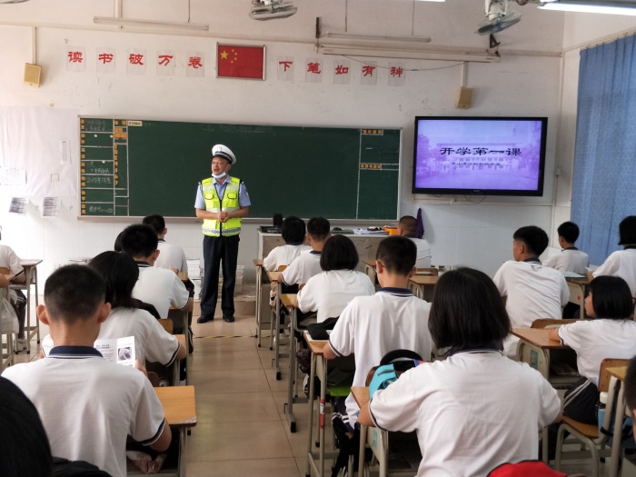 該校校長梁炳華首先發(fā)表了熱情洋溢的新學(xué)期致辭,他對新加入沙中大家庭的師生表示歡迎,然后從“9.3中國人民抗日戰(zhàn)爭勝利紀念日”說起,為全校師生上了第一堂思想政治課,要求全體師生《牢記歷史,勿忘國恥》。同時要求同學(xué)們愛國愛校,弘揚民族優(yōu)良傳統(tǒng),志存高遠,努力為理想而拼搏,為國家強大而奮斗。還要求同學(xué)樣要“厲行勤儉節(jié)約,反對鋪張浪費”,在日常學(xué)習(xí)和生活中做到勤儉節(jié)約。緊接著,法制副校長、沙欄派出所高所長為同學(xué)們作法制知識講座。高警官從校園欺凌的案例說起,要求同學(xué)們遵規(guī)守紀,不忘安全。希望同學(xué)們學(xué)會自我保護,避免違法犯罪,健康、幸福地成長。