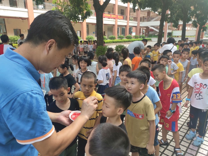 活動共分為四個流程,一、正衣冠。全體一年級的同學在主持人口令的指引下先自正衣冠,再互正衣冠,接著老師們?yōu)橥瑢W們師正衣冠。二、朱砂啟智。學校行政及班主任老師們拿起筆為每個孩子的額頭上點上朱砂,意為開啟智慧。三、擊鼓鳴志。吳博事校長先敲鼓三聲為新生啟蒙,祝愿一年級的新生能在中心小學度過快樂、收獲的六年,接著一年級的學生代表也擊鼓三聲,擊鼓的聲音傳得又遠又長,意為志向越遠大。四、啟蒙描紅。全體一年級的學生在昝燕娜老師的帶領下一撇一捺寫“人”字,同學們聽從老師的指導,莊嚴地在田字格里書寫。一個簡單的“人”字,蘊含深刻的哲理。五、誦讀弟子規(guī)。全體一年級新生齊讀《弟子規(guī)》,孩子們精神抖擻,聲音響亮,相信他們能從《弟子規(guī)》中學到正確的人生觀和價值觀,做一個有愛心、懂孝心的好學生。
