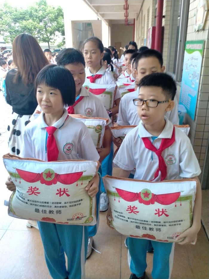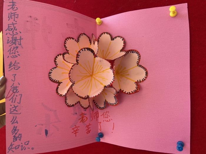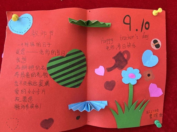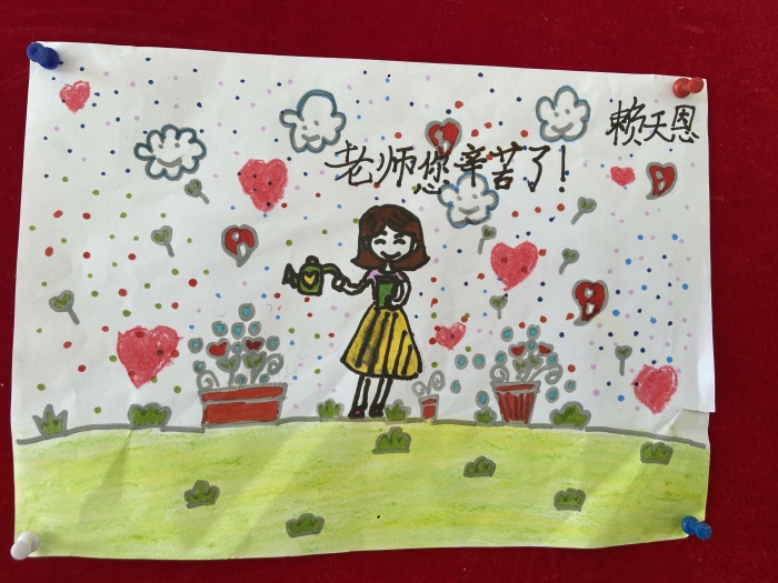慶祝活動(dòng)結(jié)束后,少先隊(duì)大隊(duì)部向全體隊(duì)員發(fā)出“童心有愛,不忘師恩”慶祝教師節(jié)活動(dòng)倡議。倡議全體隊(duì)員貫徹落實(shí)以節(jié)約為原則和用實(shí)際行動(dòng)報(bào)答恩師,表達(dá)對(duì)老師們節(jié)日的祝賀。大隊(duì)部分別組織了低、中、高年級(jí)不同的活動(dòng):一、二年級(jí)組織“童聲表恩情”活動(dòng),通過錄制小視頻的方式將節(jié)日祝福、感恩的話語送給教師;三、四年級(jí)組織“小手畫師容”活動(dòng),畫出你眼中老師的模樣;五、六年級(jí)組織“小小賀卡表心意”活動(dòng),通過親自制作賀卡,表達(dá)對(duì)老師的感謝,其中部分優(yōu)秀作品展示在學(xué)校的大堂里供師生們欣賞。