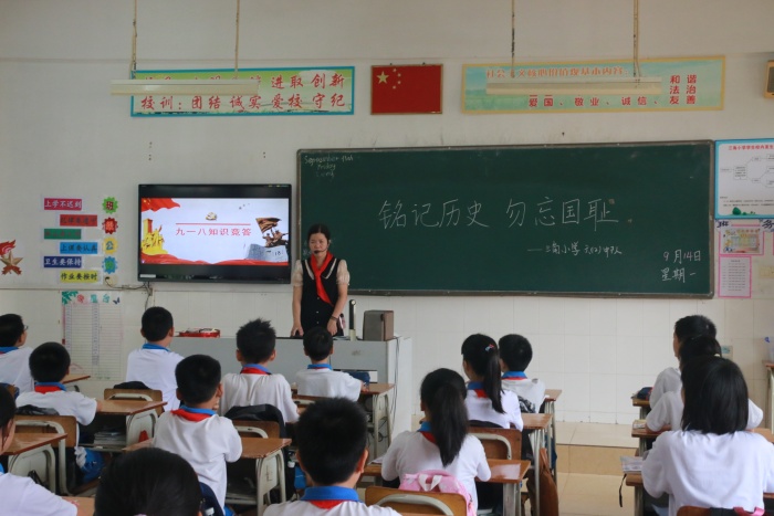 在隊(duì)會(huì)課上,老師們語(yǔ)氣沉重地講述九一八事變的起因經(jīng)過(guò)和歷史背景,并播放了還原九一八事變當(dāng)晚歷程的視頻。隨后,老師們向?qū)W生展示了一幅幅浸透血淚的歷史圖片,深重的民族苦難使人動(dòng)容,使人難忘;介紹了一位位身先士卒,為國(guó)犧牲的革命先烈——楊靖宇、趙尚志、王光宇、王德泰、趙一曼、馬占山,致敬英雄,追念英靈;講述了以冷云為首的東北抗日聯(lián)軍8名女官兵與日偽軍展開(kāi)激戰(zhàn),誓死不降,而后集體沉江,壯烈殉國(guó)的故事。學(xué)生們還進(jìn)行了九一八知識(shí)競(jìng)答,將民族的苦難記憶和偉大的愛(ài)國(guó)精神、不屈的抗?fàn)幎分居烙浶拈g。
