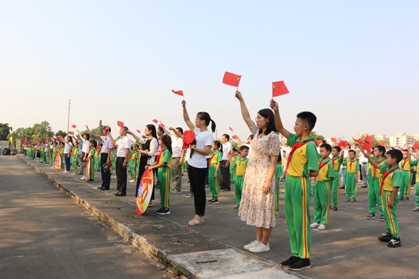 隨后,全體師生懷著無比激動澎湃的心情,高聲齊唱一曲《歌唱祖國》,大家伴著旋律搖動手中的小國旗,深情唱出了對祖國的熱愛與眷戀,唱出了廣大學子濃濃的中華情。最后,莫校長帶領全體師生懷著真摯而又自豪的心情呼號:“祖國萬歲!祖國萬歲!” 將現(xiàn)場的愛國情感推向高潮。