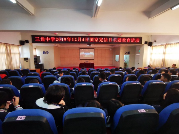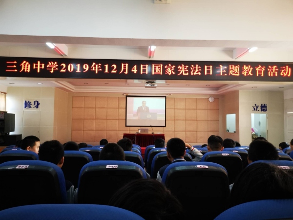 今天是第六個(gè)國(guó)家憲法日,也迎來(lái)了憲法宣傳周。為了開(kāi)展憲法宣傳、弘揚(yáng)憲法精神、讓中學(xué)生學(xué)習(xí)憲法,提高法律意識(shí)。12月4日三角中學(xué)利用晨讀時(shí)間,全校各班在教室里由班長(zhǎng)帶讀憲法(摘選),并抽調(diào)近300名學(xué)生在報(bào)告廳觀看直播,并進(jìn)行 “爭(zhēng)做守法中學(xué)生” 宣誓活動(dòng)。