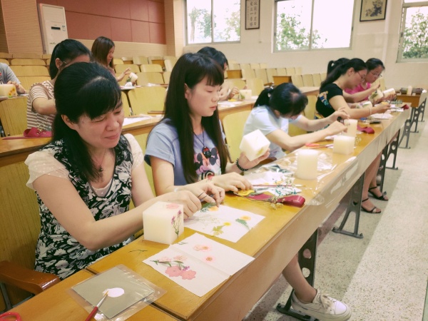 此次活動(dòng)非常受老師們的喜愛(ài),雍陌小學(xué)有27位教師參與了此次活動(dòng)。晨光服務(wù)中心的鄭潔嵐社工先是細(xì)心地給教師們講有關(guān) “壓花”蠟燭的來(lái)歷、介紹,還通過(guò)圖片教大家如何去搭配和構(gòu)思,然后再耐心地演示給大家看如何把花草壓在白色的蠟燭上。在教師們親自動(dòng)手感受壓花工藝過(guò)程中,鄭社工和她的兩個(gè)同伴非常認(rèn)真、耐心地給教師們一對(duì)一指導(dǎo)。整個(gè)過(guò)程持續(xù)了一個(gè)多小時(shí),但雍陌小學(xué)的老師們都非常地專注于壓花,陶醉其中,完全忘記了一天的疲憊,也忘記了時(shí)間。