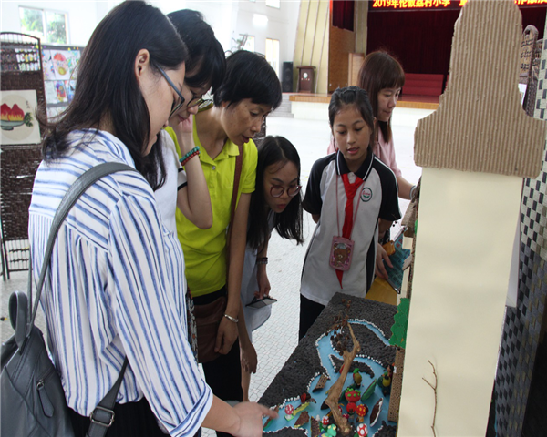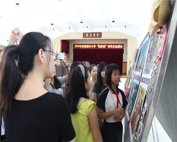活動在倫教街道小學美術中心教研組組長鄺寶均老師主持下,首先參觀了“荔村小學美術特色作業(yè)展示”,到會的老師們在學生的引領和講解下在禮堂進行觀展。此次展出的美術特色作業(yè)內容豐富多彩,形式多種多樣。有裝飾味道強的重彩畫,有別具匠心的拼貼畫,有活靈活現(xiàn)的手工紙花,有書寫端正的手抄報,還有創(chuàng)意無限的手工立體作品和橡皮泥作品等等,內容豐富的作品彰顯了老師們設計的豐富與巧妙,更凸顯了學生們的認真努力和奇思妙想。在展覽上,荔村小學的學生們清晰大膽地介紹自己的作品和回答老師們的問題,同時認真地傾聽老師們的建議。老師們一邊認真地觀看,一邊時不時拿出手機拍照記錄,作為自己今后輔導的參考。