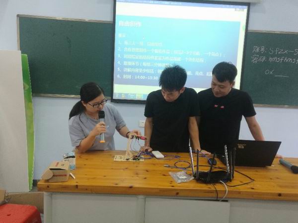 經(jīng)過一天的基礎(chǔ)知識(shí)學(xué)習(xí),第二天下午,分小組進(jìn)行項(xiàng)目制作和路演匯報(bào)。各個(gè)小組的老師都使出渾身解數(shù),把兩天培訓(xùn)中所學(xué)到的技術(shù)以及團(tuán)隊(duì)的創(chuàng)意發(fā)揮得淋漓盡致,在硬件有限的條件下實(shí)現(xiàn)各種有創(chuàng)意的創(chuàng)客作品,路演匯報(bào)環(huán)節(jié)精彩紛呈,充分展示了我區(qū)在創(chuàng)客教育的師資潛力。