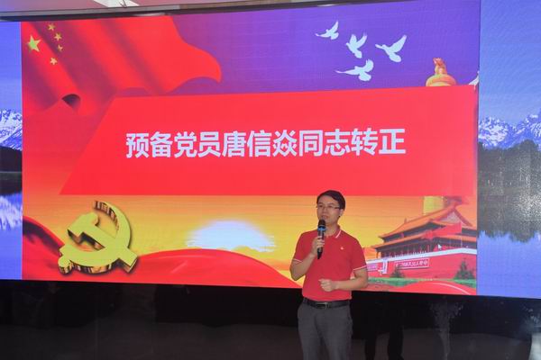 黨員大會分三項(xiàng)議程。第一項(xiàng)議程是預(yù)備黨員唐信焱同志的轉(zhuǎn)正討論及表決。唐信焱同志作了近一年來的思想、學(xué)習(xí)、生活、工作匯報(bào),隆重地向黨總支提出轉(zhuǎn)正申請。其入黨介紹人及其他黨員同志分別對其表現(xiàn)作了表態(tài)發(fā)言。全體黨員舉手表決,全票通過,同意唐信焱同志按時(shí)轉(zhuǎn)正,正式成為中國共產(chǎn)黨黨員。唐信焱同志表示以后要一如既往,不忘初心,牢記使命!