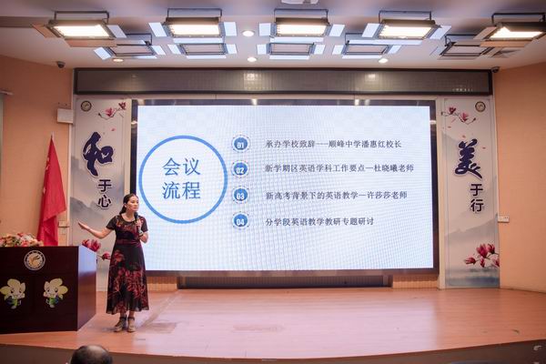 本次英語學科大教研工作會議由順德區(qū)教育發(fā)展中心教研室小學英語教研員田湘軍老師主持。會議開始首先由廣東省英語特級教師、順峰中學潘惠紅校長講話。她代表順峰中學歡迎順德區(qū)英語教研骨干們。她希望各位英語科骨干在順德區(qū)教育高質量發(fā)展的征途上上,積極行動起來,讓英語學科的教育教學質量更上一個臺階。