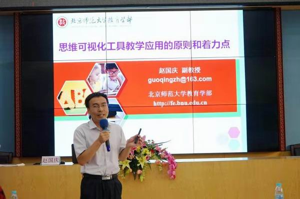 首場(chǎng)講座是北師大趙國(guó)慶副教授做了主題《思維可視化工具教學(xué)應(yīng)用的原則和著力點(diǎn)》講座。趙教授從思維可視化工具教學(xué)應(yīng)用中出現(xiàn)的典型問題、思維可視化工具作用機(jī)理、思維可視化工具教學(xué)應(yīng)用原則以及著力點(diǎn)等方面,從理論和實(shí)踐的角度闡釋了思維可視化工具“為什么”“怎么用”存在的問題及解決策略,令與會(huì)的不少老師大開眼界。