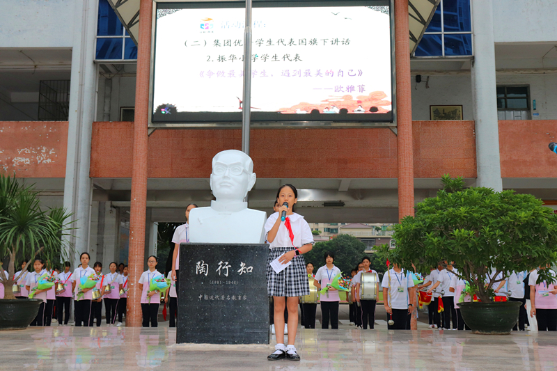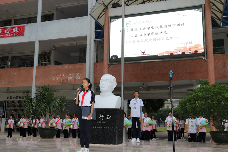 莊嚴(yán)的升旗儀式完畢后,育美教育集團(tuán)容山小學(xué)的譚懿同學(xué)、育美教育集團(tuán)振華小學(xué)的歐雅菲同學(xué)分別作了題為《用勤奮成就更好的自己》和《爭做最美學(xué)生,遇到最美的自己》的演講。育美教育集團(tuán)文華中學(xué)夏仁斌主任作《為美好人生奠基》主題講話。