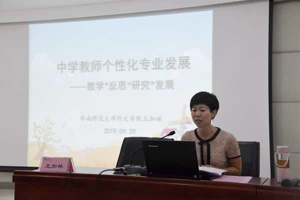 工作室的專業(yè)導(dǎo)師、華南師范大學(xué)外國(guó)語(yǔ)言文化學(xué)院的王加林副教授做了主題為“中學(xué)教師個(gè)性化專業(yè)發(fā)展――教學(xué)反思 研究 發(fā)展”的專題講座。王教授從2021年即將開(kāi)始的新高考展開(kāi),指出英語(yǔ)教學(xué)應(yīng)以科學(xué)、踏實(shí)的態(tài)度提高學(xué)生英語(yǔ)能力。她還用實(shí)例指導(dǎo)與會(huì)者如何選題、教研以及如何開(kāi)展行動(dòng)研究。
