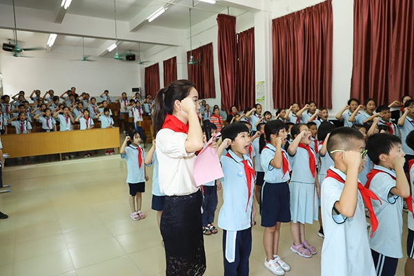 最后一項議程是一年級建立少先隊組織儀式。一年級的新隊員們佩戴上紅領巾,大會為新中隊委員會委員和小隊長授標志、為新中隊授中隊旗。鮮艷的紅領巾將伴隨著新隊員們展開新的征程。