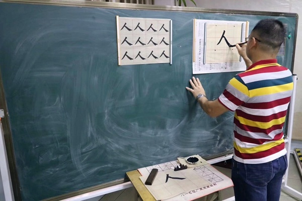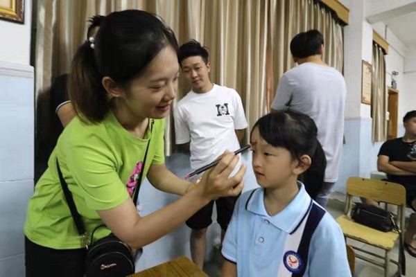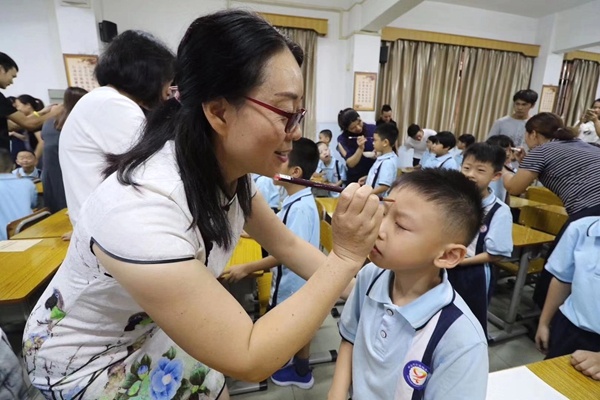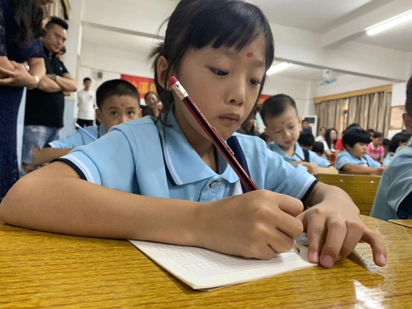 圣獅小學(xué)黃校長(zhǎng)致辭后,開(kāi)筆禮正式開(kāi)始。孩子們?cè)谥鞒秩嗽捳Z(yǔ)的引導(dǎo)下,孩子們正衣冠、朱砂啟智、擊鼓鳴志、描紅“人”字、齊誦弟子規(guī)和孝親敬師。在自正衣冠環(huán)節(jié)中,孩子們知道了著裝要整潔。通過(guò)朱砂啟智環(huán)節(jié),孩子們得到了領(lǐng)導(dǎo)、老師和家長(zhǎng)的祝福,通過(guò)點(diǎn)“痣”,開(kāi)啟智慧,從此眼明心亮,好讀書(shū),讀好書(shū),讀書(shū)好。擊鼓鳴志環(huán)節(jié)中,黃校長(zhǎng)擊的三聲鼓聲,聲音響且傳得遠(yuǎn),寓意著孩子們志向遠(yuǎn)大。第四環(huán)節(jié)是啟蒙描紅,黃解球老師分別用粉筆和毛筆示范書(shū)寫(xiě)“人”字。孩子在開(kāi)筆禮現(xiàn)場(chǎng)寫(xiě)“人”字,寓意著在人生的啟蒙階段,要學(xué)會(huì)做人。隨后,一年級(jí)新生在丁老師的帶領(lǐng)下,齊誦弟子規(guī)的節(jié)選部分。最后,為傳承“孝、禮”好家風(fēng),發(fā)揮圣獅小學(xué)校園文化核心“傳承好家風(fēng)”的傳統(tǒng),孩子們?cè)谥鞒秩说囊龑?dǎo)下,向老師和父母行鞠躬禮,表示感恩。