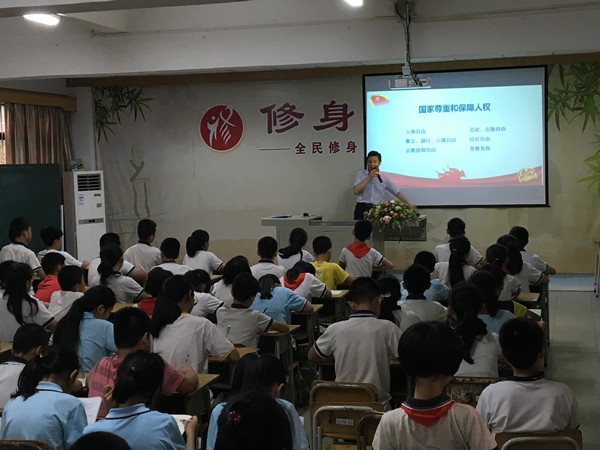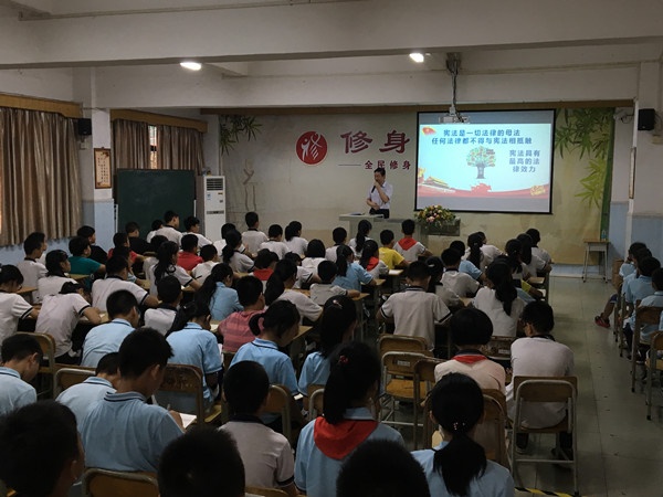 為推進(jìn)圣獅小學(xué)憲法教育活動(dòng),圍繞“遵崇憲法、學(xué)習(xí)憲法、遵守憲法、維護(hù)憲法、運(yùn)用憲法”這一主題,2019年5月30日上午,圣獅小學(xué)邀請(qǐng)了廣東廣中律師事務(wù)所張愛文律師為五、六年級(jí)學(xué)生開展“憲法在我心中”為主題的憲法教育講座。