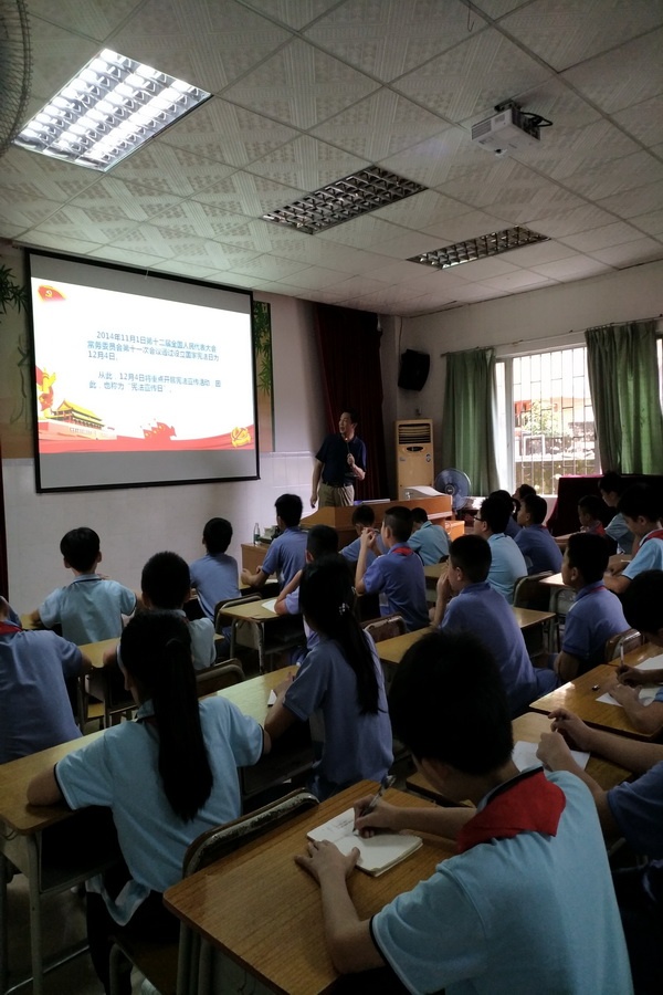張愛文律師首先以簡單直觀的選擇題向學生提出問題:我們國家的國家憲法日是幾月幾日?同學們用排除法,迅速獲知12月4日是我們國家的國家憲法日。學習氣氛一下子被激活,學生感到輕松愉快。接下來,張律師出示一段文字介紹到:2014年11月1日第十二屆全國人民代表大會常務委員會第十一次會議通過設立國家憲法日為12月4日。從此,12月4日將重點開展憲法宣傳活動,因此,也稱為“憲法宣傳日”。
