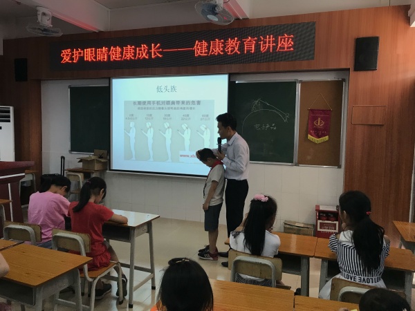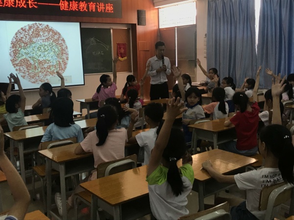 第一環(huán)節(jié)由徐醫(yī)生向大家進行護眼科普知識講座。他用5月5日是全國愛眼日和中國近視患者居世界首位為切入點,引起學生的好奇心。接著,結合生動有趣的生活故事深入淺出地闡述了近視給學習、生活帶來的極大不便。從關于我們的眼睛、什么是近視、影響近視的因素、如何預防近視等幾個方面教育孩子們保護眼睛。同時,還通過提問、知識問答等方式宣傳保護眼睛的方法,提醒同學們在讀書學習時,光線要充足舒適,要避免反光,閱讀時間勿太長,坐姿要端正,看書距離應適中。在家里,睡眠時間要充足,作息有規(guī)律,多做戶外運動。徐醫(yī)生充分調動學生的積極性,大部分學生發(fā)表自己的看法,深入地認識到愛護眼睛的重要性。