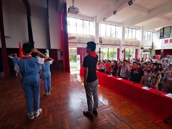 接下來,大會審議通過了新一屆大隊(duì)委名單,并為新一屆大隊(duì)委授臂章。審議還通過了第一屆學(xué)校少工委委員名單,鄭校長為第一屆學(xué)校少工委委員頒發(fā)聘書,為學(xué)校少工委成立揭牌,中山市申明亭學(xué)校第一屆學(xué)校少先隊(duì)工作委員會宣告成立!最后,少工委副主任賴強(qiáng)強(qiáng)為本次大會的順利召開進(jìn)行總結(jié)發(fā)言。中山市申明亭學(xué)校大隊(duì)輔導(dǎo)員林良友老師帶領(lǐng)隊(duì)員們呼號,退隊(duì)旗?;顒咏Y(jié)束后,大家一起合影留念。