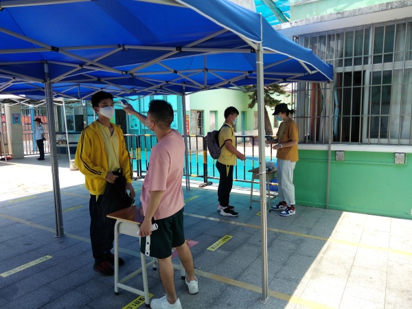 12:00剛過,負責(zé)進行交通疏導(dǎo)的公安民警早早來到校門口,以防接送學(xué)生的車輛在校門口發(fā)生擁堵。12:30分后,同學(xué)們陸續(xù)來到學(xué)校,按照地面張貼的引導(dǎo)標(biāo)線來到進校通道,老師先掃同學(xué)們粵康碼,正常后,再到體溫測檢測處,測體溫正常,進行手部消毒,然后才能進入校園。